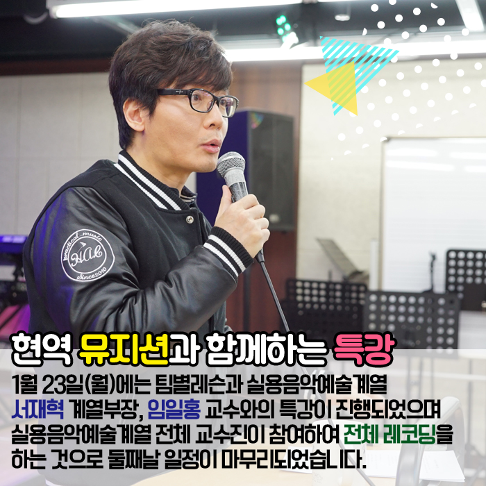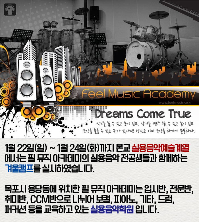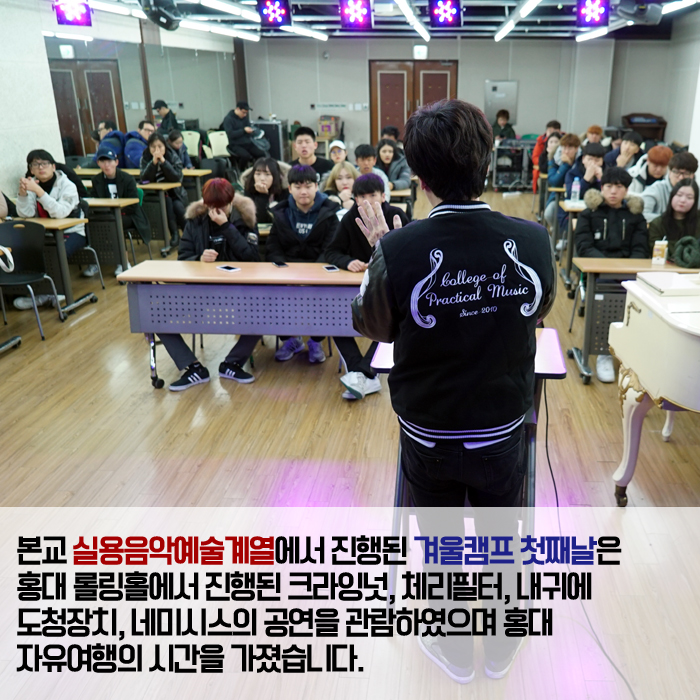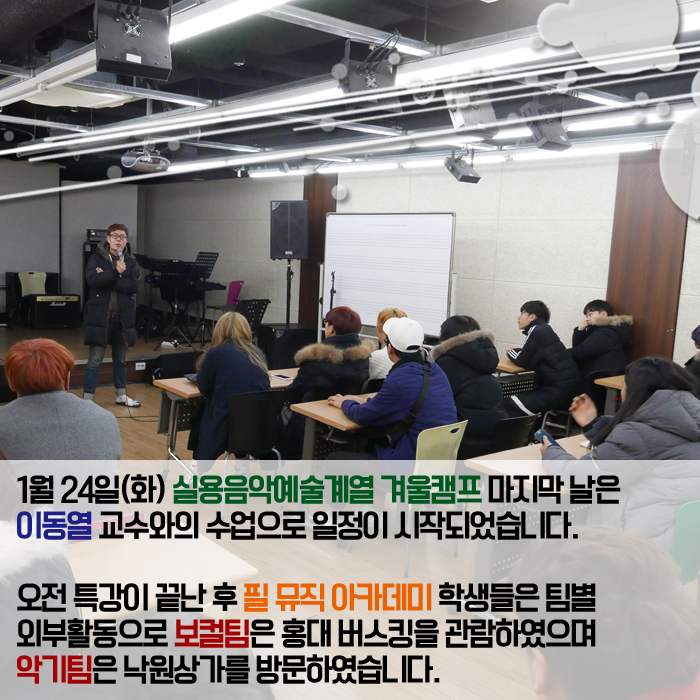 1월 22일(일) ~ 1월 24일(화)까지 본교 실용음악예술계열에서는 필 뮤직 아카데미의 실용음악 전공생들과 함께하는 겨울캠프를 실시하였습니다.