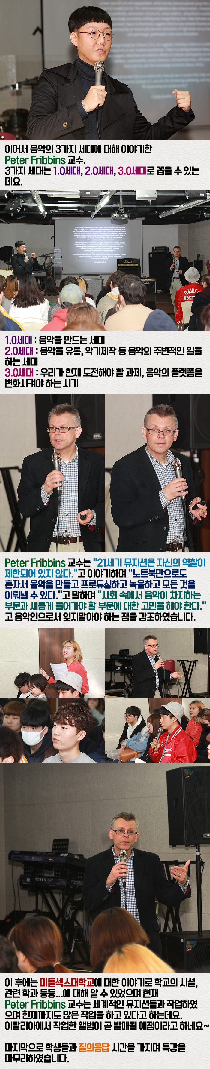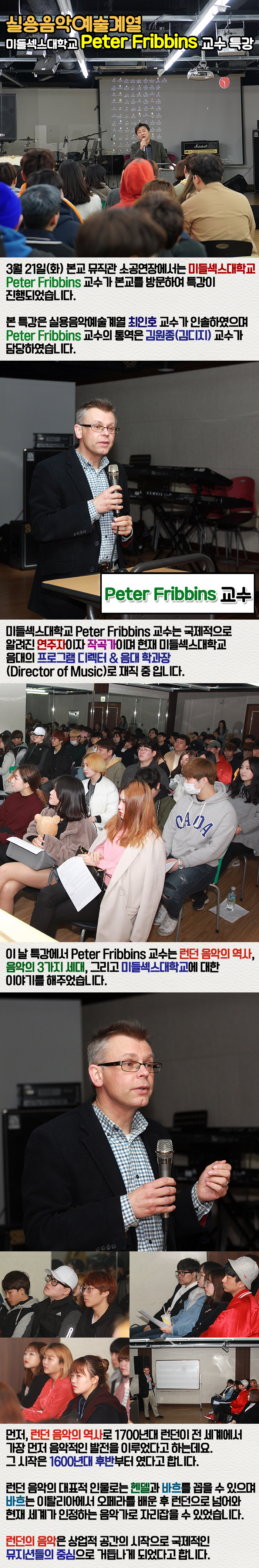 3월 21일(화) 본교 뮤직관 소공연장에서는 미들섹스대학교 Peter Fribbins 교수가 본교를 방문하여 특강이 진행되었습니다.