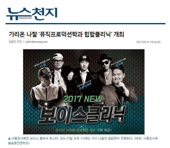 오는 27일 오후 1시에 진행되는 나찰의 보이스클리닉 힙합편 참가신청은 서울호서예전 홈페이지에서 가능하다. 아울러 6월(가수 임도혁)과 7월(가수 소울다이브)에 진행되는 보이스클리닉도 함께 신청이 가능하다.