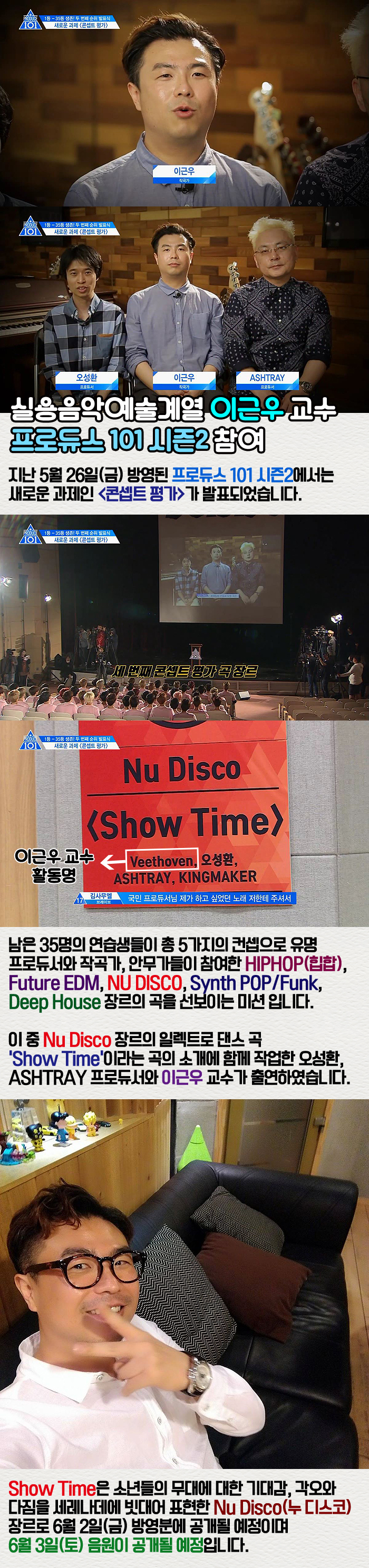 Nu Disco 장르의 일렉트로 댄스 곡 ‘Show Time’이라는 곡의 소개에 함께 작업한 오성환, ASHTRAY 프로듀서와 이근우 교수가 출연하였습니다.
