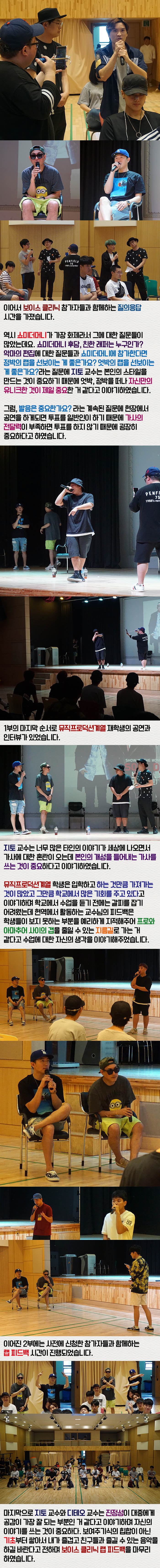 7월 29일(토) 본교 예술관 대공연장에서는 소울다이브라는 팀으로 활동중인 뮤직프로덕션계열 지토 교수와 디테오 교수가 함께하는 보이스 클리닉 랩 피드백이 진행되었습니다.