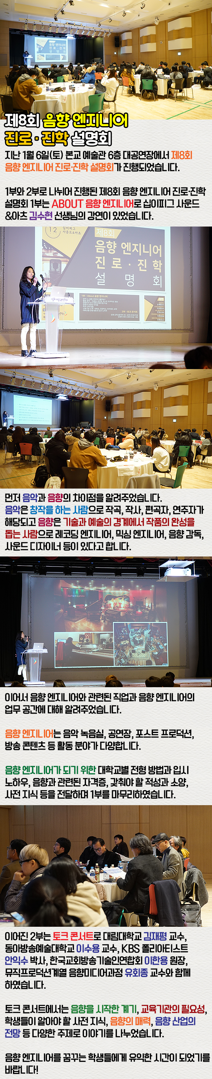 지난 1월 6일(토) 본교 예술관 6층 대공연장에서 제8회 음향 엔지니어 진로·진학 설명회가 진행되었습니다.