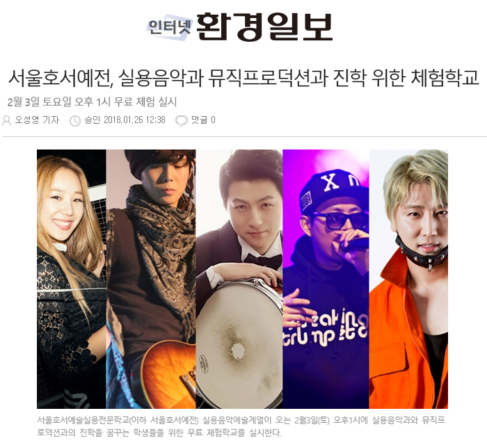 [환경일보] 오성영 기자 = 서울호서예술실용전문학교(이하 서울호서예전) 실용음악예술계열이 오는 2월3일(토) 오후1시에 실용음악과와 뮤직프로덕션과의 진학을 꿈꾸는 학생들을 위한 무료 체험학교를 실시한다고 26일 밝혔다.