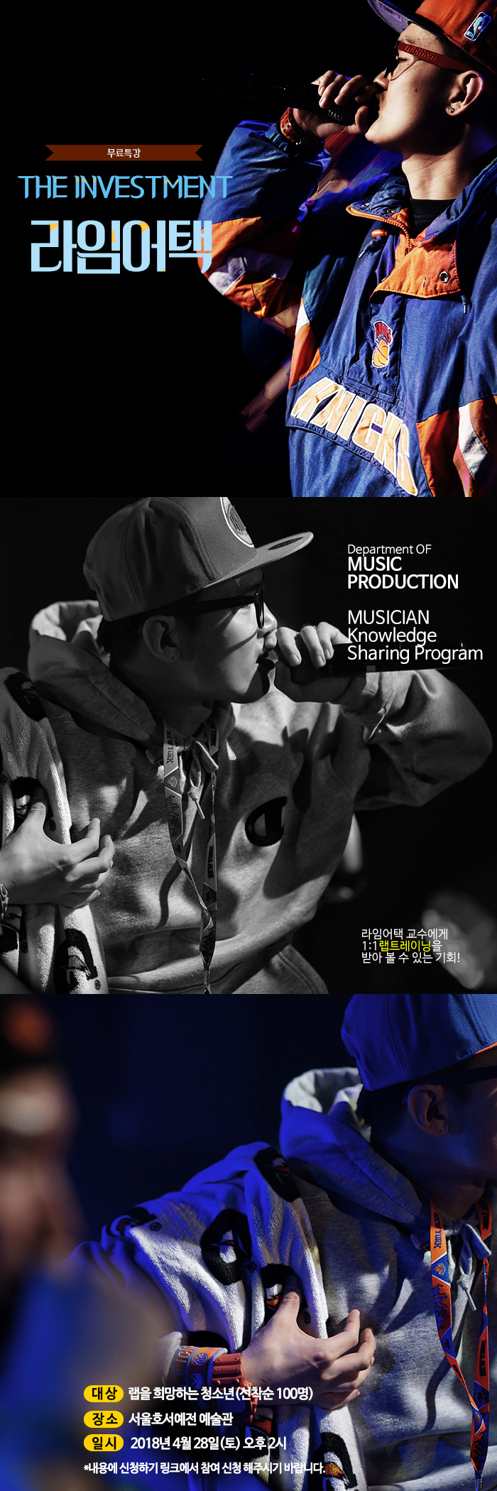 허클베리피, JJK, 팔로알토, 술제이에 이어 라임어택 교수의 특별 심화 랩 트레이닝 특강 THE INVESTMENT vol.5가 오는 4월 28일(토) 오후2시에 개최됩니다.