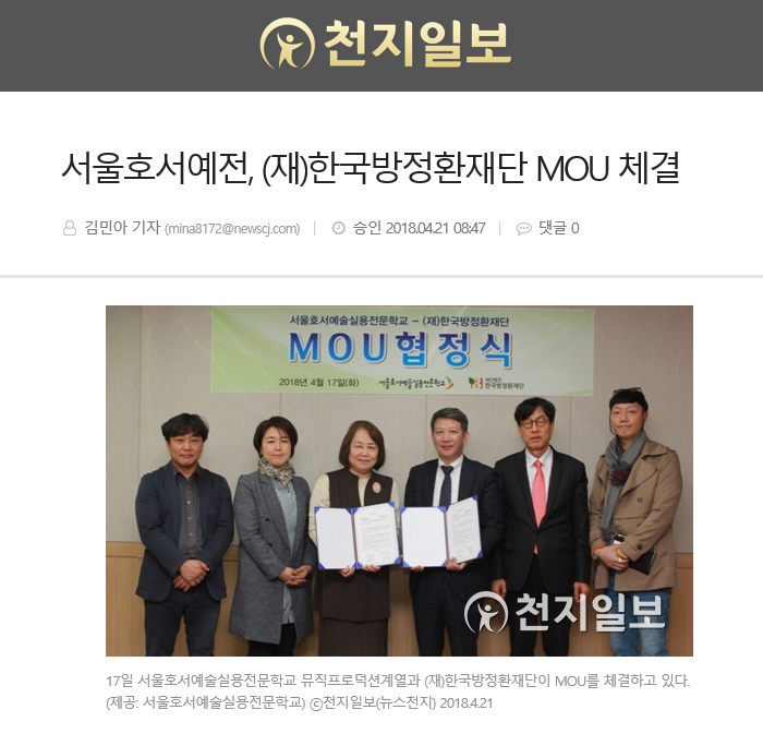 [천지일보=김민아 기자] 서울호서예술실용전문학교 뮤직프로덕션계열이 지난 17일 (재)한국방정환재단과 장학사업 및 각종 문화행사에 대한 후원, 홍보협조 행사 공동추진으로 상호발전을 도모하기 위한 MOU를 체결했다.