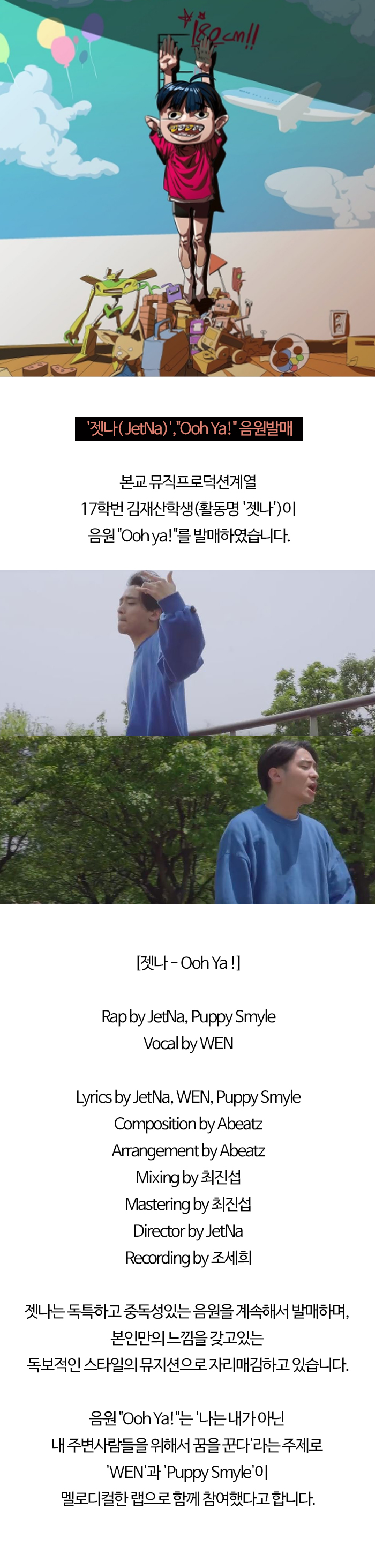 본교 뮤직프로덕션계열 17학번 김재산학생(활동명 '젯나')이 음원 "Ooh ya!"를 발매하였습니다.