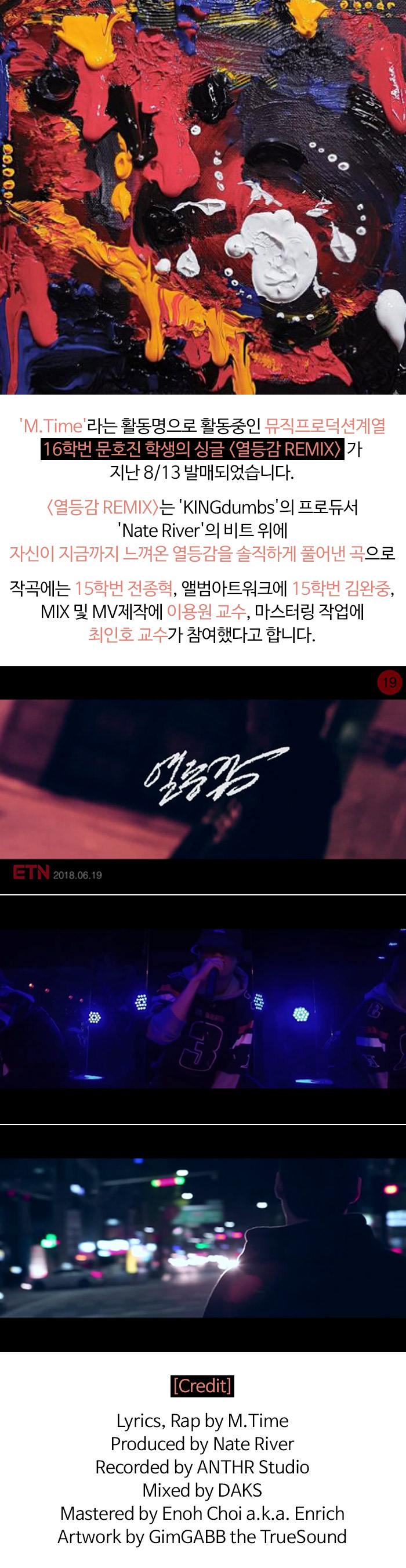 뮤직프로덕션계열 16학번 문호진 학생(활동명. M.Time)의 싱글 <열등감 REMIX>가 지난 8/13 발매되었습니다.