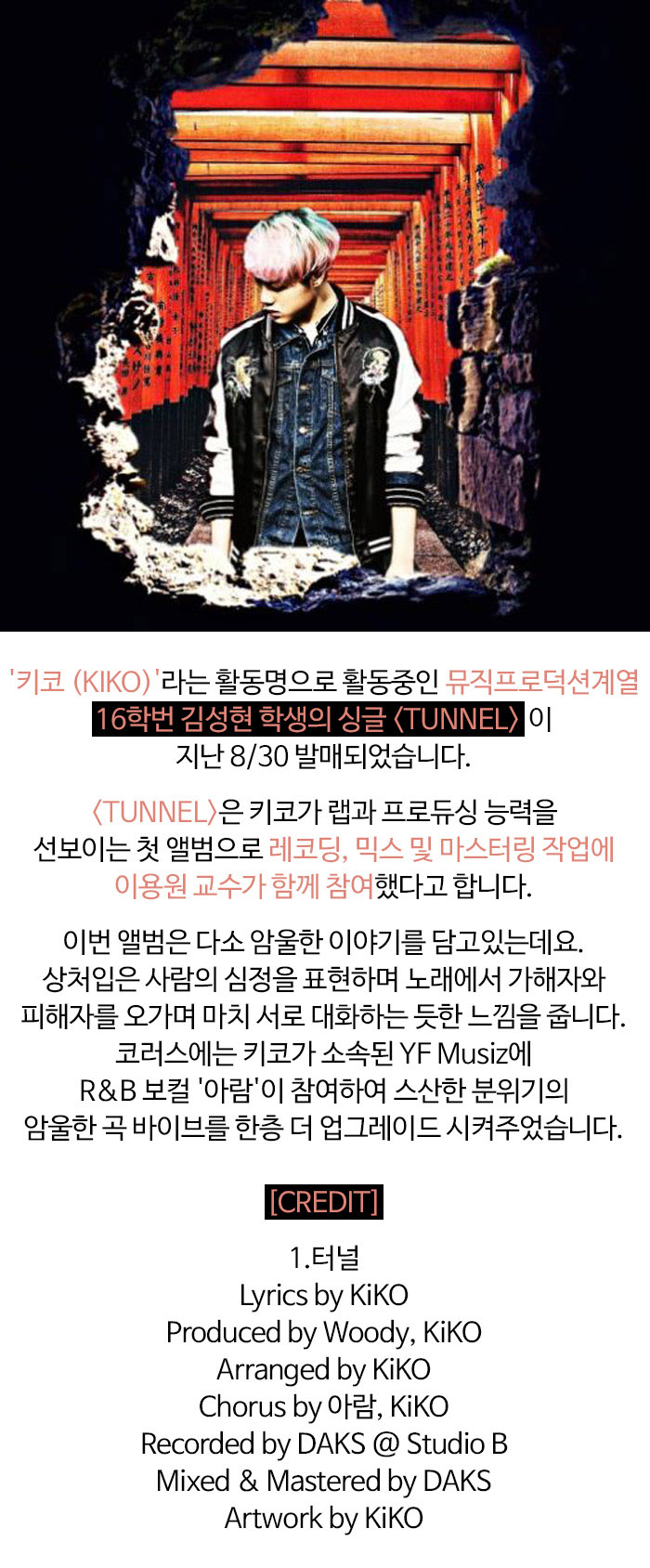 '키코 (KIKO)'라는 활동명으로 활동중인 뮤직프로덕션계열 16학번 김성현 학생의 싱글