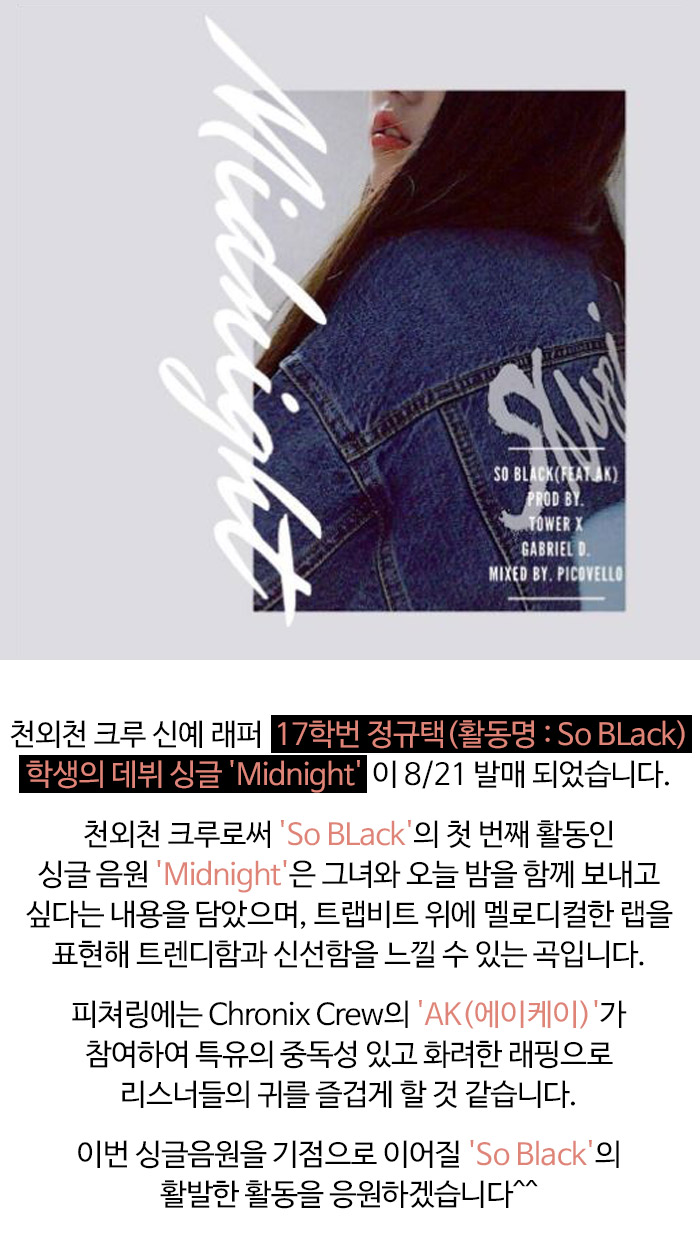 천외천 크루 신예 래퍼 17학번 정규택(활동명 : So BLack)학생의 데뷔 싱글 'Midnight'이 8/21 발매 되었습니다.
