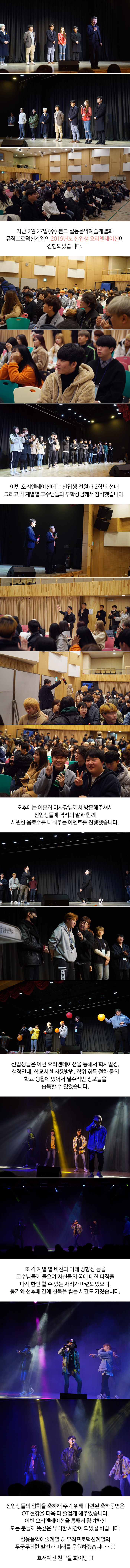 지난 2월 27일 본교 실용음악예술계열과 뮤직프로덕션계열의 2019년도 신입생 오리엔테이션이 진행되었습니다.
