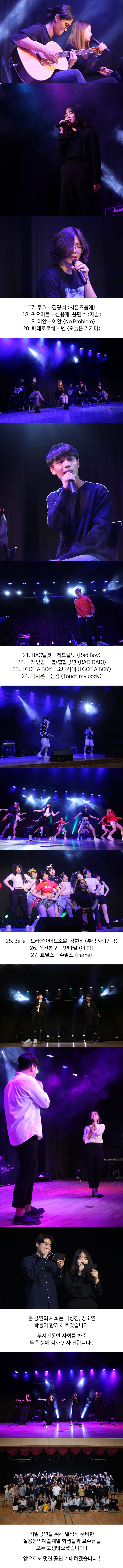 총 27팀의 무대를 볼 수 있었던 기말공연 학생들은 자신의 끼와 재능을 마음껏 펼치며 무대를 뜨거운 열기로 가득 채웠습니다.