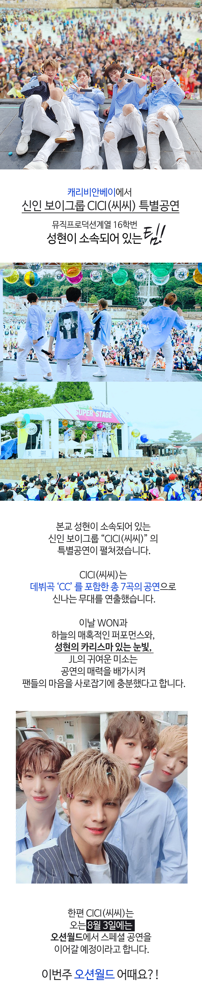 본교 뮤직프로덕션계열 16학번 성현이 소속되어 있는 신인 보이그룹 “CICI(씨씨)” 의 특별공연이 7월 27일 캐리비안베이에서 펼쳐졌습니다.