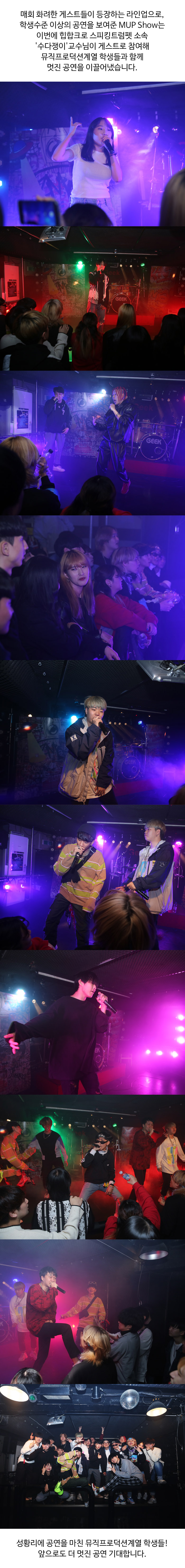 뮤직프로덕션계열 학생들이 직접 기획하고 참여한 힙합정기공연인 'MUP Show(뮤프쇼)'를 지난 18일 신촌 긱라이브하우스 공연장에서 성황리에 마쳤습니다.