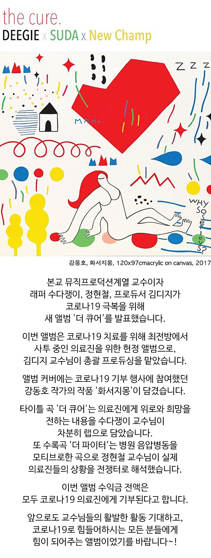 서울호서예술실용전문학교 뮤직프로덕션계열 교수이자 래퍼 수다쟁이, 정현철, 프로듀서 김디지가 코로나19 극복을 위해 새 앨범 '더 큐어'를 발표했습니다.