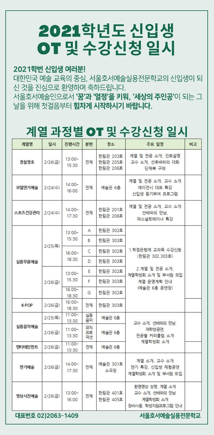 2021학년도 신입생 OT 및 수강신청 일시 안내