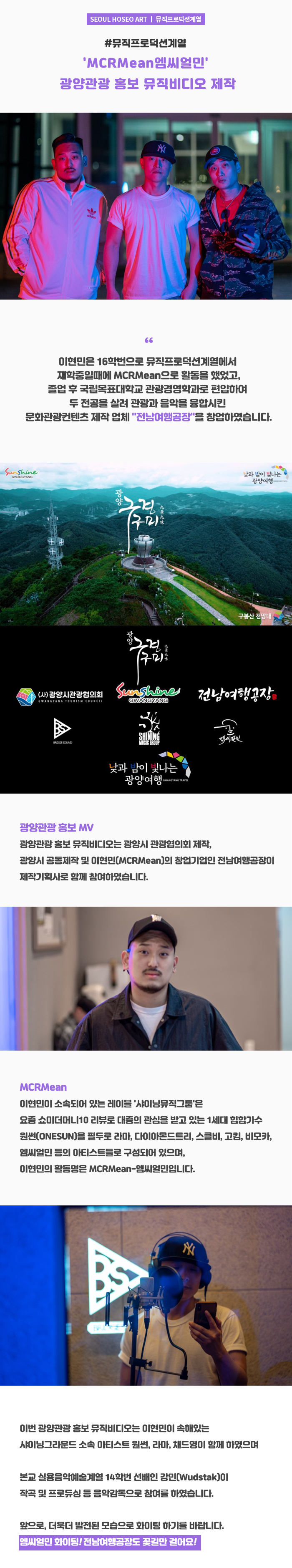 서울호서예술실용전문학교(서울호서예전) 뮤직프로덕션계열 졸업생 이현민(MCRMean) 학생이 광양관광 홍보 뮤직비디오를 제작하였습니다.