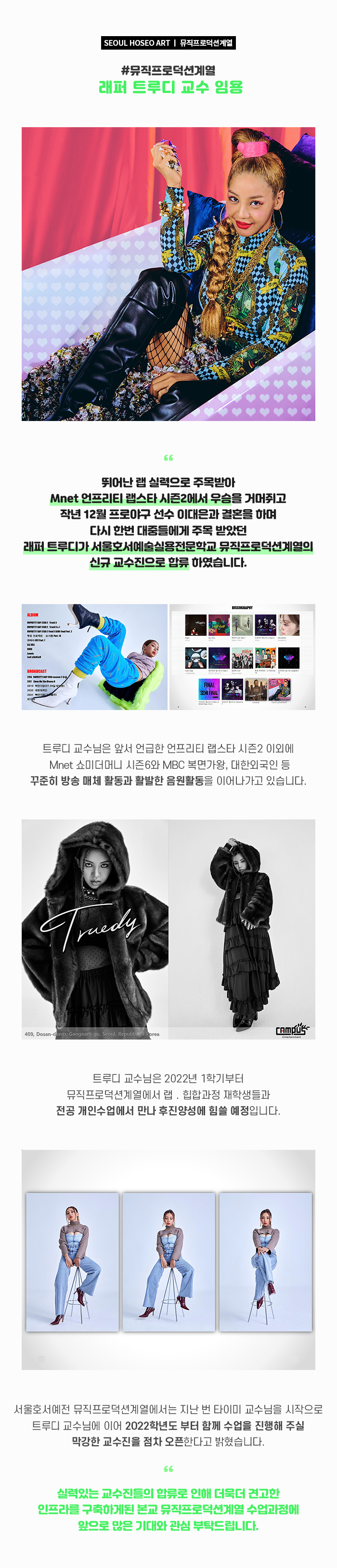 뛰어난 랩 실력으로 주목받아 Mnet 언프리티 랩스타 시즌2에서 우승을 거머쥐고 작년 12월 프로야구 선수 이대은과 결혼을 하며 다시 한번 대중들에게 주목 받았던 래퍼 트루디가 서울호서예술실용전문학교 뮤직프로덕션계열의 신규 교수진으로 합류 하였습니다.