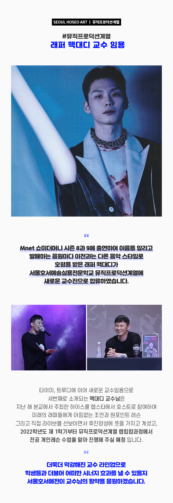 Mnet 쇼미더머니 시즌 8과 9에 출연하여 이름을 알리고 발매하는 음원마다 이전과는 다른 음악 스타일로 호평을 받은 래퍼 맥대디가 서울호서예술실용전문학교 뮤직프로덕션계열에 새로운 교수진으로 합류하였습니다. 타이미, 트루디에 이어 새로운 교수임용으로 세번째로 소개되는 맥대디 교수님은 지난 해 본교에서 주최한 하이스쿨 랩스타에서 호스트로 참여하여 미래의 래퍼들에게 아낌없는 조언과 원포인트 레슨 그리고 직접 라이브를 선보이면서 후진양성에 뜻을 가지고 계셨고, 2022학년도 제 1학기부터 뮤직프로덕션계열 랩힙합과정에서 전공 개인레슨 수업을 맡아 진행해 주실 예정 입니다.