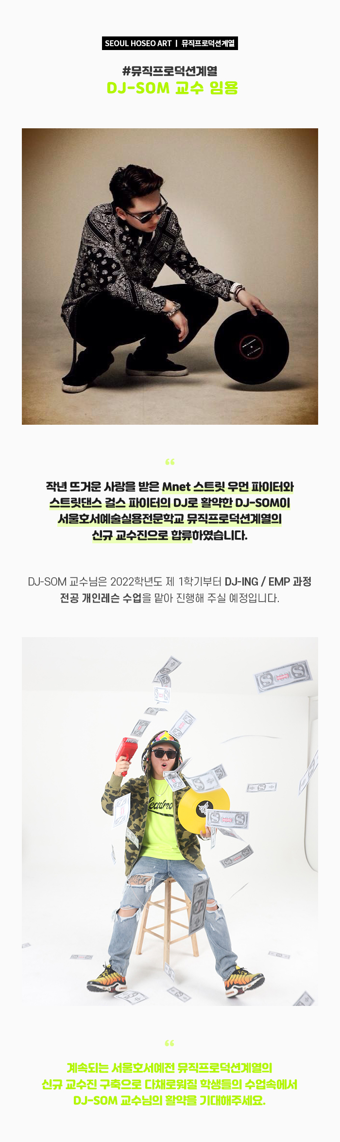 작년 뜨거운 사랑을 받은 Mnet 스트릿 우먼 파이터와 스트릿댄스 걸스 파이터의 DJ로 활약한 DJ-SOM이 서울호서예술실용전문학교 뮤직프로덕션계열의 신규 교수진으로 합류하였습니다. DJ-SOM 교수님은 2022학년도 제 1학기부터 DJ-ING / EMP 과정 전공 개인레슨 수업을 맡아 진행해 주실 예정입니다.