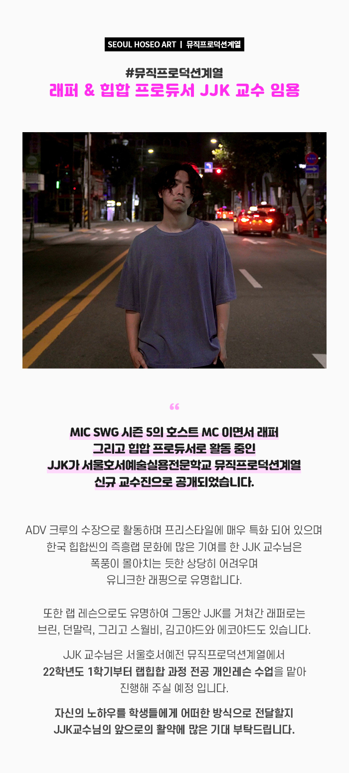 MIC SWG 시즌 5의 호스트 MC 이면서 래퍼 그리고 힙합 프로듀서로 활동 중인 JJK가 서울호서예술실용전문학교 뮤직프로덕션계열 신규 교수진으로 공개되었습니다. ADV 크루의 수장으로 활동하며 프리스타일에 매우 특화 되어 있으며 한국 힙합씬의 즉흥랩 문화에 많은 기여를 한 JJK 교수님은 폭풍이 몰아치는 듯한 상당히 어려우며 유니크한 래핑으로 유명합니다.