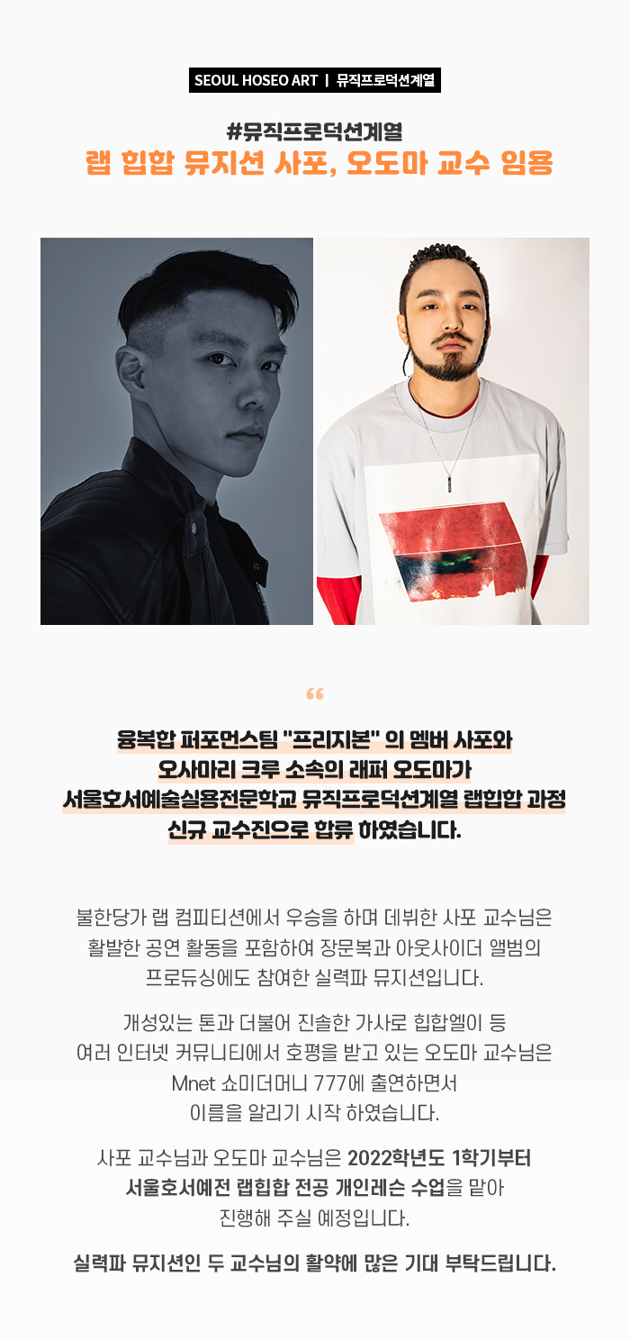 융복합 퍼포먼스팀 "프리지본" 의 멤버 사포와 오사마리 크루 소속의 래퍼 오도마가 서울호서예술실용전문학교 뮤직프로덕션계열 랩힙합 과정 신규 교수진으로 합류 하였습니다. 불한당가 랩 컴피티션에서 우승을 하며 데뷔한 사포 교수님은 활발한 공연 활동을 포함하여 장문복과 아웃사이더 앨범의 프로듀싱에도 참여한 실력파 뮤지션입니다. 개성있는 톤과 더불어 진솔한 가사로 힙합엘이 등 여러 인터넷 커뮤니티에서 호평을 받고 있는 오도마 교수님은 Mnet 쇼미더머니 777에 출연하면서 이름을 알리기 시작 하였습니다.