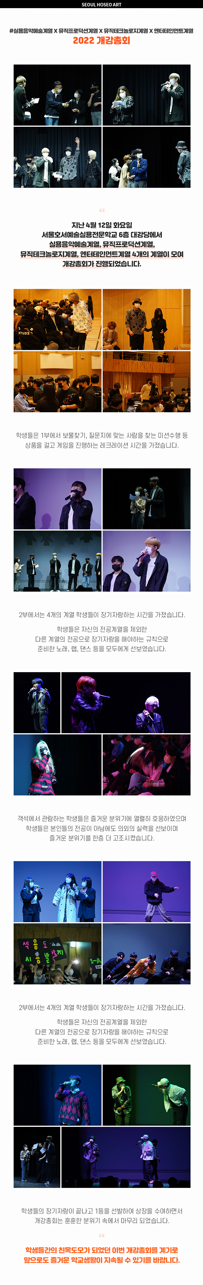 지난 4월 12일 화요일 서울호서예술실용전문학교 6층 대강당에서 실용음악예술계열, 뮤직프로덕션계열, 뮤직테크놀로지계열, 엔터테인먼트계열 4개의 계열이 모여 개강총회가 진행되었습니다. 학생들은 1부에서 보물찾기, 질문지에 맞는 사람을 찾는 미션수행 등 상품을 걸고 게임을 진행하는 레크레이션 시간을 가졌습니다.