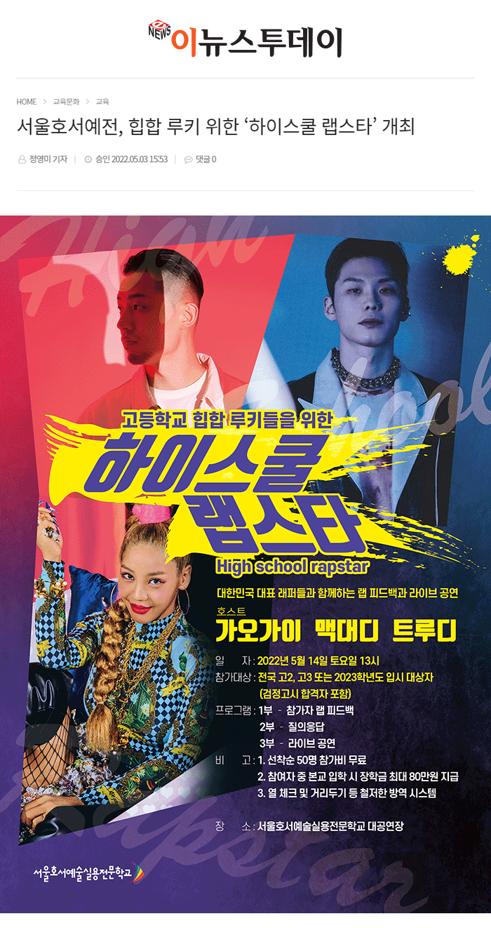 서울호서예술실용전문학교(이하 서울호서예전)에서 고등학생 힙합 루키들을 위한 ‘하이스쿨 랩스타’를 오는 14일에 개최한다.