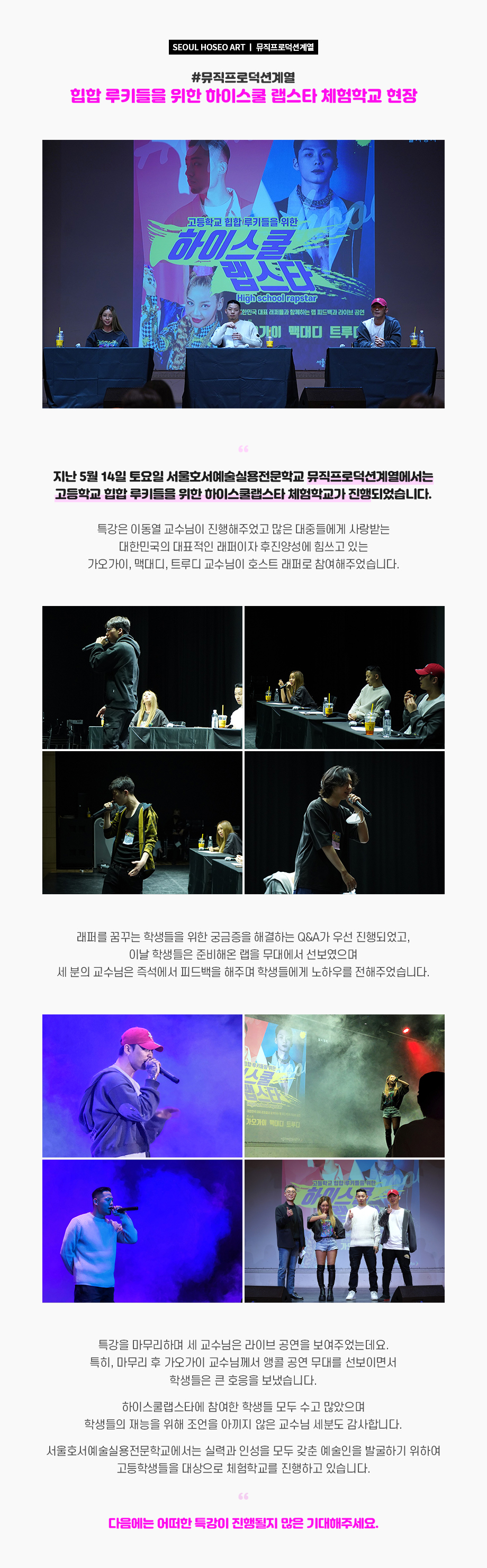 지난 5월 14일 토요일 서울호서예술실용전문학교 뮤직프로덕션계열에서는 고등학교 힙합 루키들을 위한 하이스쿨랩스타 체험학교가 진행되었습니다. 특강은 이동열 교수님이 진행해주었고 많은 대중들에게 사랑받는 대한민국의 대표적인 래퍼이자 후진양성에 힘쓰고 있는 가오가이, 맥대디, 트루디 교수님이 호스트 래퍼로 참여해주었습니다.