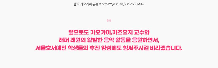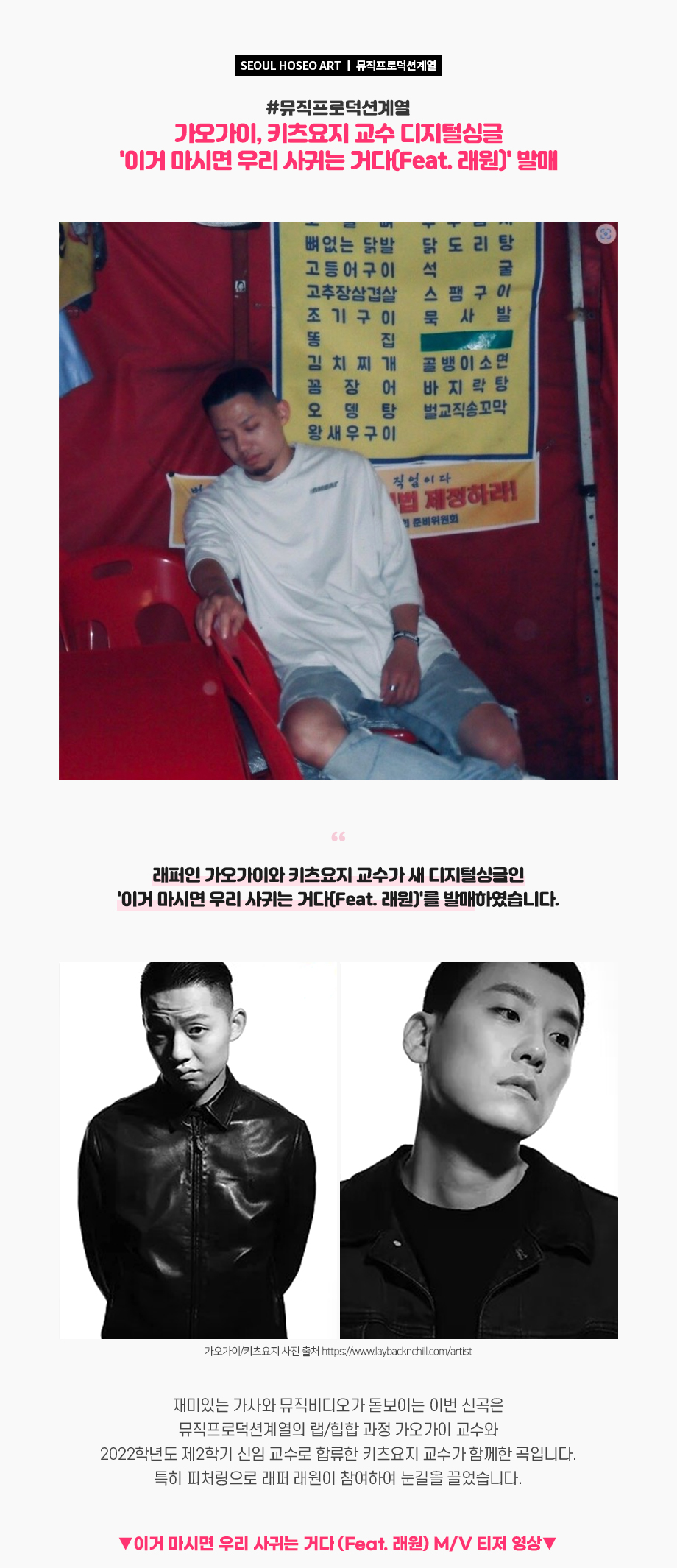 래퍼인 가오가이와 키츠요지 교수가 새 디지털싱글인 '이거 마시면 우리 사귀는 거다(Feat. 래원)'를 발매하였습니다. 재미있는 가사와 뮤직비디오가 돋보이는 이번 신곡은 뮤직프로덕션계열의 랩/힙합 과정 가오가이 교수와 2022학년도 제2학기 신임 교수로 합류한 키츠요지 교수가 함께한 곡입니다. 특히 피처링으로 래퍼 래원이 참여하여 눈길을 끌었습니다.