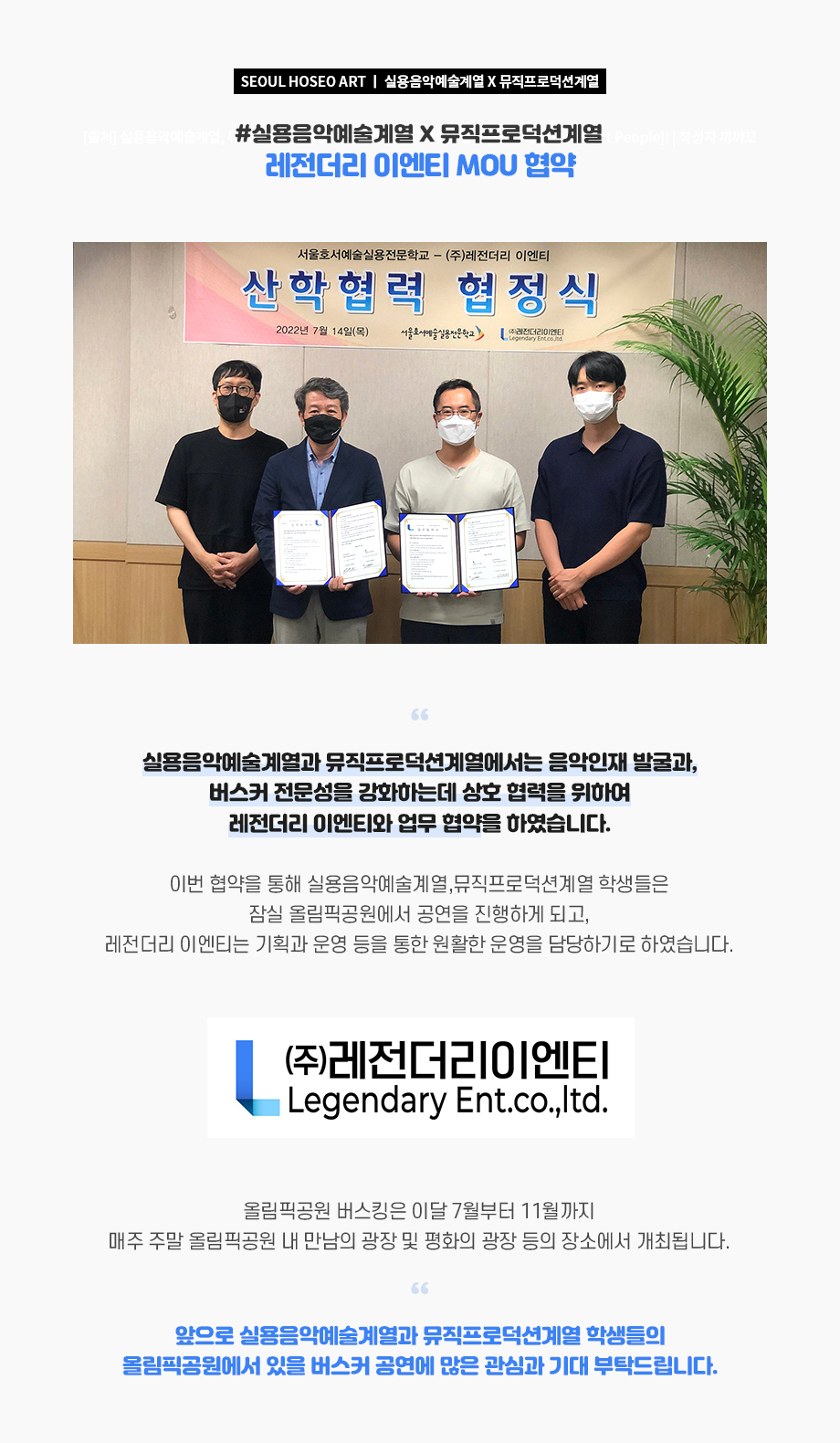 실용음악예술계열과 뮤직프로덕션계열에서는 음악인재 발굴과, 버스커 전문성을 강화하는데 상호 협력을 위하여 레전더리 이엔티와 업무 협약을 하였습니다. 이번 협약을 통해 실용음악예술계열,뮤직프로덕션계열 학생들은 잠실 올림픽공원에서 공연을 진행하게 되고, 레전더리 이엔티는 기획과 운영 등을 통한 원활한 운영을 담당하기로 하였습니다.