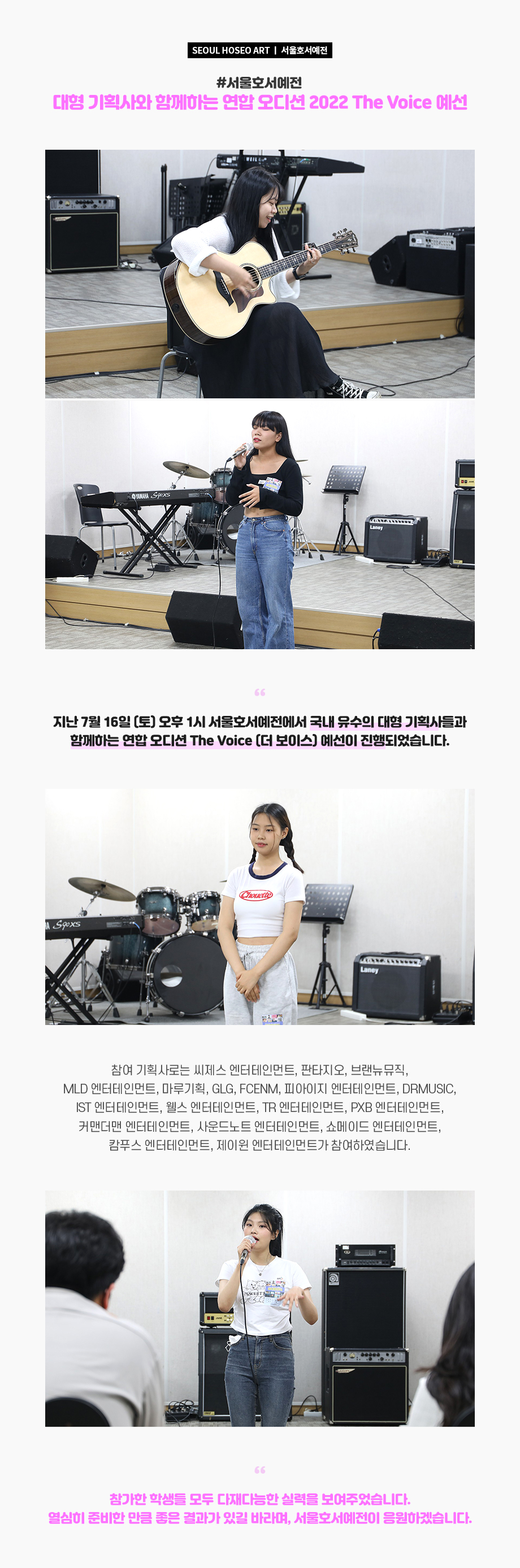 지난 7월 16일 (토) 오후 1시 서울호서예전에서 국내 유수의 대형 기획사들과 함께하는 연합 오디션 The Voice (더 보이스) 예선이 진행되었습니다. 참여 기획사로는 씨제스 엔터테인먼트, 판타지오, 브랜뉴뮤직, MLD 엔터테인먼트, 마루기획, GLG, FCENM, 피아이지 엔터테인먼트, DRMUSIC, IST 엔터테인먼트, 웰스 엔터테인먼트, TR 엔터테인먼트, PXB 엔터테인먼트, 커맨더맨 엔터테인먼트, 사운드노트 엔터테인먼트, 쇼메이드 엔터테인먼트, 캄푸스 엔터테인먼트, 제이윈 엔터테인먼트가 참여하였습니다.