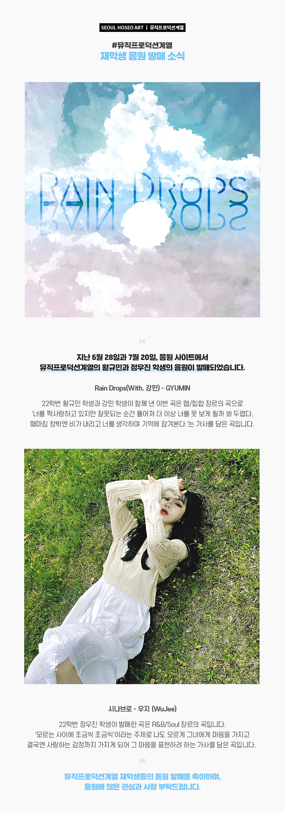 지난 6월 28일과 7월 20일, 음원 사이트에서 뮤직프로덕션계열의 황규민과 정우진 학생의 음원이 발매되었습니다. Rain Drops(With. 강민) - GYUMIN 22학번 황규민 학생과 강민 학생이 함께 낸 이번 곡은 랩/힙합 장르의 곡으로 '너를 짝사랑하고 있지만 잘못되는 순간 틀어져 더 이상 너를 못 보게 될까 봐 두렵다. 때마침 창밖엔 비가 내리고 너를 생각하며 기억에 잠겨본다.'는 가사를 담은 곡입니다.