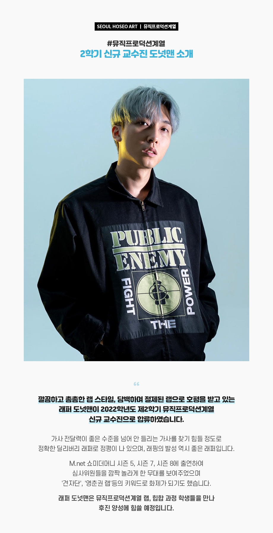 깔끔하고 촘촘한 랩 스타일, 담백하며 절제된 랩으로 호평을 받고 있는 래퍼 도넛맨이 2022학년도 제2학기 뮤직프로덕션계열 신규 교수진으로 합류하였습니다. 가사 전달력이 좋은 수준을 넘어 안 들리는 가사를 찾기 힘들 정도로 정확한 딜리버리 래퍼로 정평이 나 있으며, 래핑의 발성 역시 좋은 래퍼입니다.