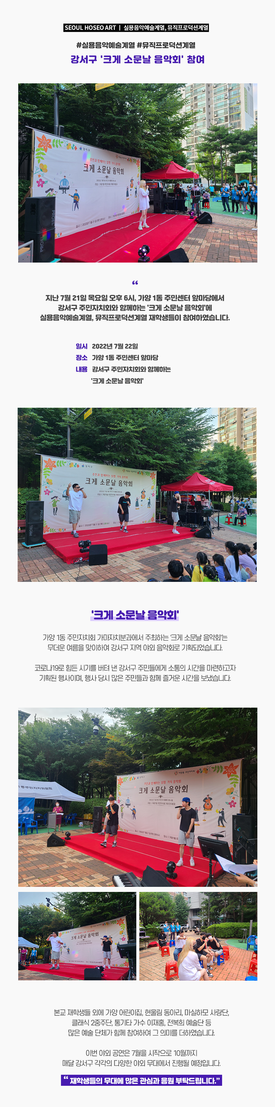 지난 7월 21일 목요일 오후 6시, 가양 1동 주민센터 앞마당에서 강서구 주민자치회와 함께하는 '크게 소문날 음악회'에 실용음악예술계열, 뮤직프로덕션계열 재학생들이 참여하였습니다.