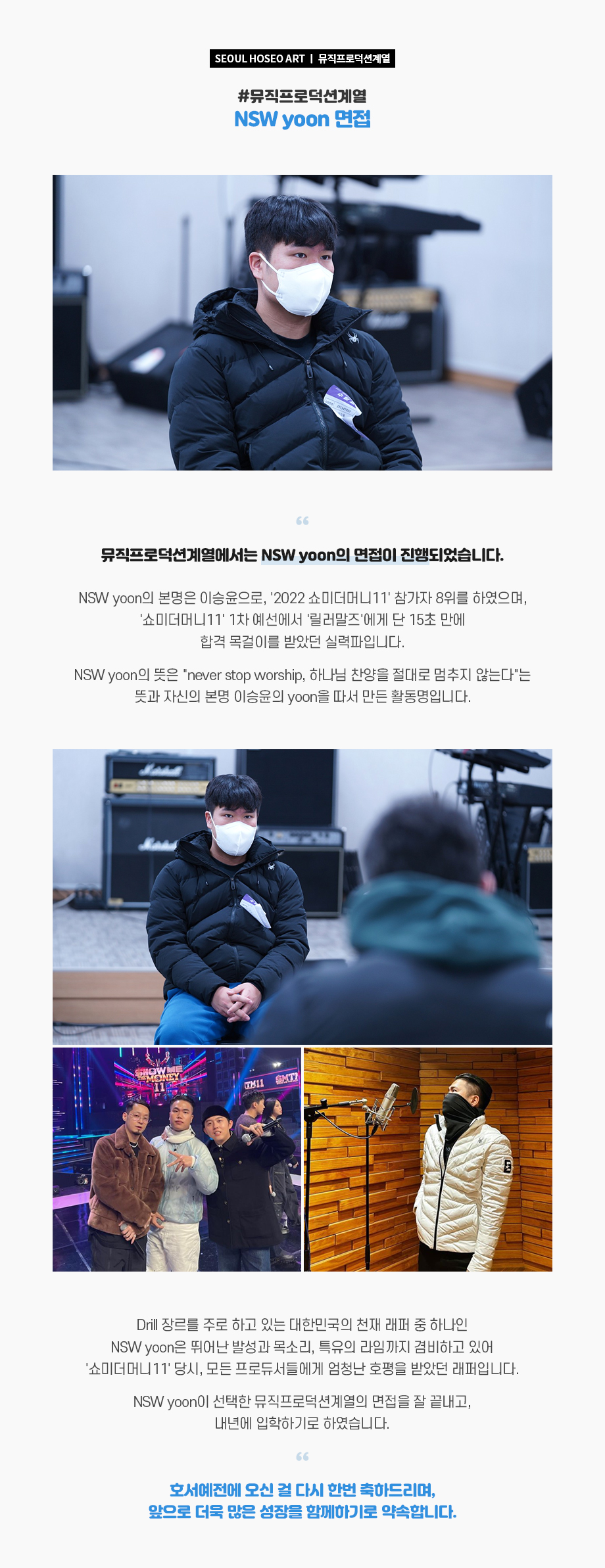 뮤직프로덕션계열에서는 NSW yoon의 면접이 진행되었습니다. NSW yoon의 본명은 이승윤으로, '2022 쇼미더머니11' 참가자 8위를 하였으며, '쇼미더머니11' 1차 예선에서 '릴러말즈'에게 단 15초 만에 합격 목걸이를 받았던 실력파입니다.