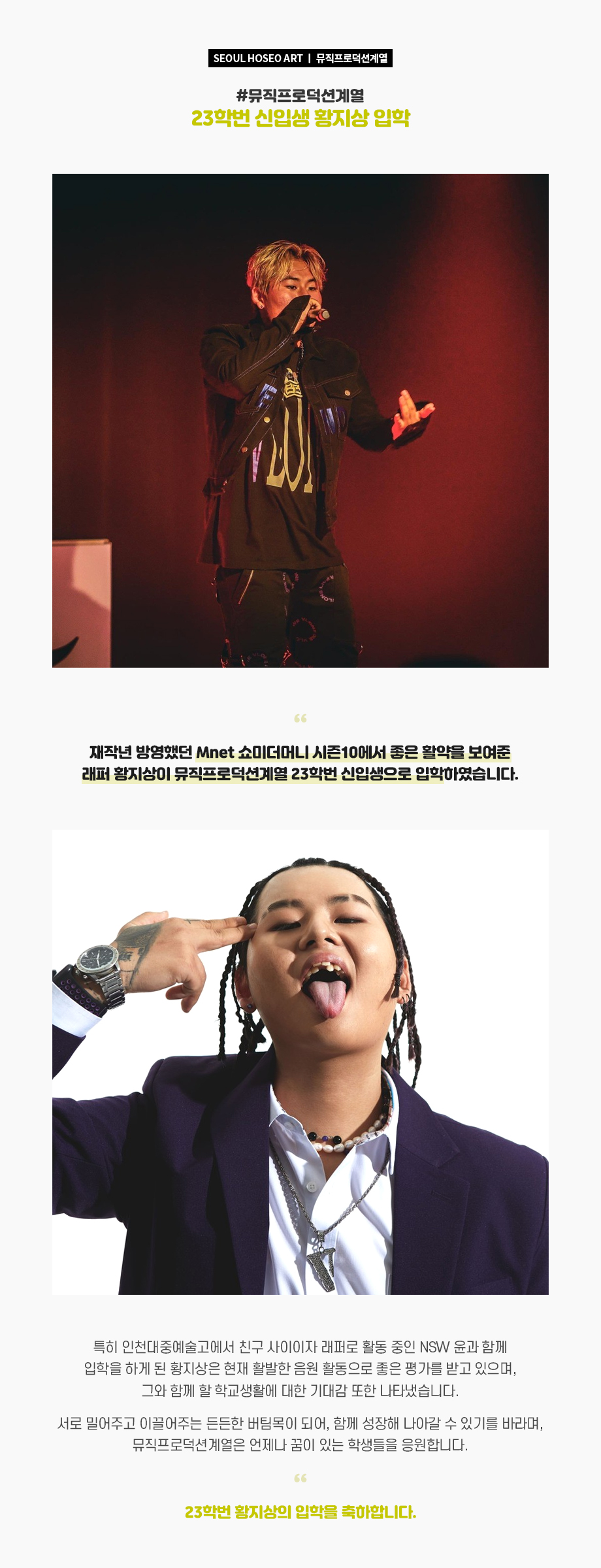 재작년 방영했던 Mnet 쇼미더머니 시즌10에서 좋은 활약을 보여준 래퍼 황지상이 뮤직프로덕션계열 23학번 신입생으로 입학하였습니다.