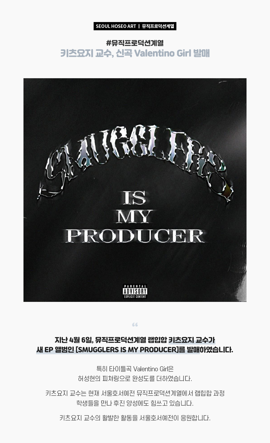 지난 4월 6일, 뮤직프로덕션계열 랩힙합 키츠요지 교수가 새 EP 앨범인 [SMUGGLERS IS MY PRODUCER]를 발매하였습니다. 특히 타이틀곡 Valentino Girl은 허성현의 피쳐링으로 완성도를 더하였습니다.
