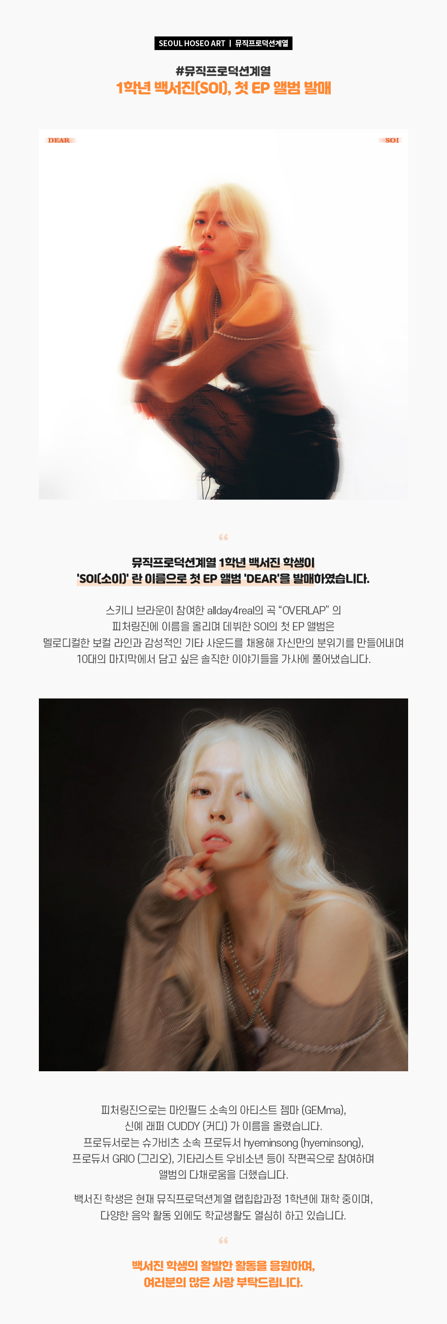 뮤직프로덕션계열 1학년 백서진 학생이 'SOI(소이)' 란 이름으로 첫 EP 앨범 'DEAR'을 발매하였습니다. 스키니 브라운이 참여한 allday4real의 곡 “OVERLAP” 의 피처링진에 이름을 올리며 데뷔한 SOI의 첫 EP 앨범은 멜로디컬한 보컬 라인과 감성적인 기타 사운드를 채용해 자신만의 분위기를 만들어내며 10대의 마지막에서 담고 싶은 솔직한 이야기들을 가사에 풀어냈습니다.