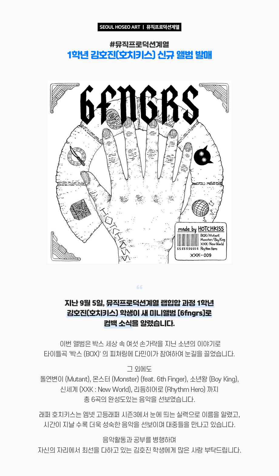 지난 9월 5일, 뮤직프로덕션계열 랩힙합 과정 1학년 김호진(호치키스) 학생이 새 미니앨범 [6fngrs] 로 컴백 소식을 알렸습니다. 이번 앨범은 박스 세상 속 여섯 손가락을 지닌 소년의 이야기로 타이틀곡 '박스 (BOX)' 의 피쳐링에 다민이가 참여하여 눈길을 끌었습니다.