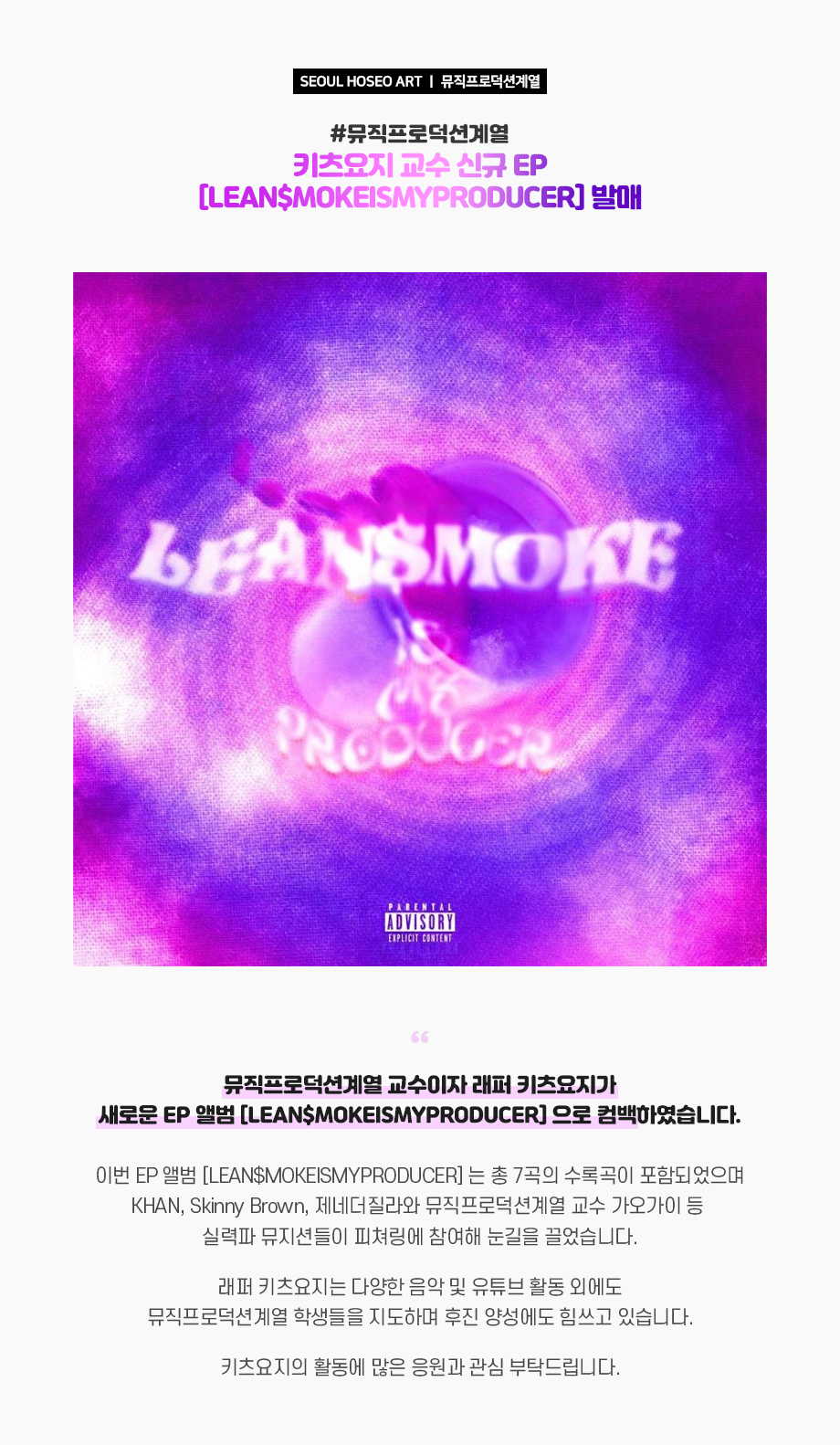 뮤직프로덕션계열 교수이자 래퍼 키츠요지가 새로운 EP 앨범 [LEAN$MOKEISMYPRODUCER] 으로 컴백하였습니다. 이번 EP 앨범 [LEAN$MOKEISMYPRODUCER] 는 총 7곡의 수록곡이 포함되었으며 KHAN, Skinny Brown, 제네더질라와 뮤직프로덕션계열 교수 가오가이 등 실력파 뮤지션들이 피쳐링에 참여해 눈길을 끌었습니다.