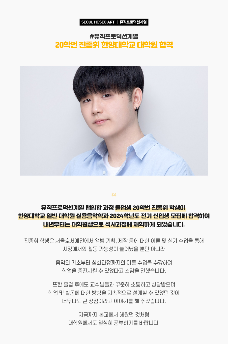 뮤직프로덕션계열 랩힙합 과정 졸업생 20학번 진종휘 학생이 한양대학교 일반 대학원 실용음악학과 2024학년도 전기 신입생 모집에 합격하여 내년부터는 대학원생으로 석사과정에 재학하게 되었습니다. 진종휘 학생은 서울호서예전에서 앨범 기획, 제작 등에 대한 이론 및 실기 수업을 통해 시장에서의 활동 가능성이 늘어났을 뿐만 아니라 음악의 기초부터 심화과정까지의 이론 수업을 수강하여 학업을 증진시킬 수 있었다고 소감을 전했습니다.