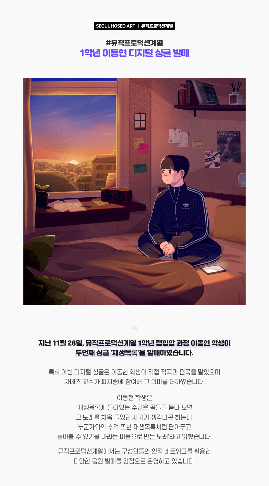 지난 11월 28일, 뮤직프로덕션계열 1학년 랩힙합 과정 이동현 학생이 두번째 싱글 '재생목록'을 발매하였습니다. 특히 이번 디지털 싱글은 이동현 학생이 직접 작곡과 편곡을 맡았으며 자메즈 교수가 피쳐링에 참여해 그 의미를 더하였습니다.