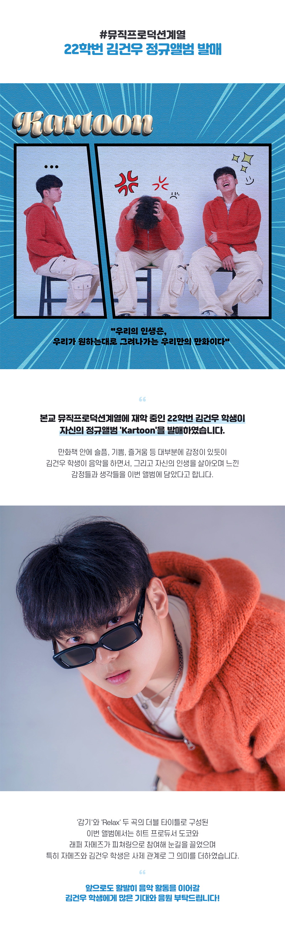 본교 뮤직프로덕션계열에 재학 중인 22학번 김건우 학생이 자신의 정규앨범 'Kartoon'을 발매하였습니다. 만화책 안에 슬픔, 기쁨, 즐거움 등 대부분에 감정이 있듯이 김건우 학생 자신도 음악을 하면서 그리고 자신의 인생을 살아오며 느낀 감정들과 생각들을 이번 앨범에 담았다고 합니다.