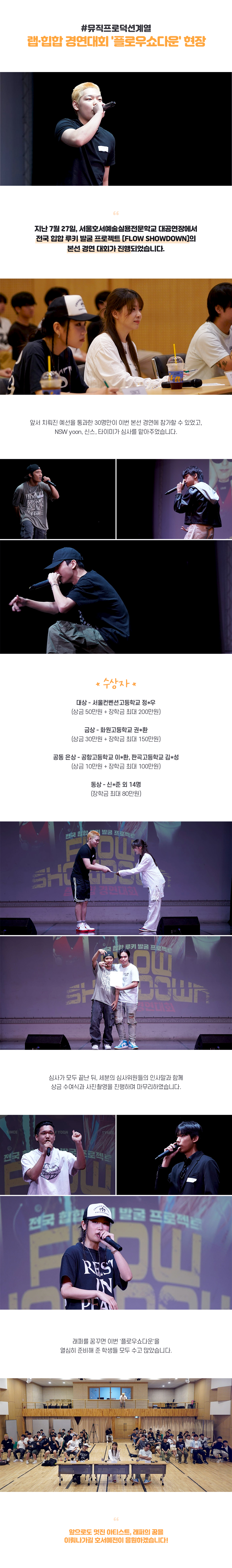 지난 7월 27일, 서울호서예술실용전문학교 대공연장에서 전국 힙합 루키 발굴 프로젝트 '플로우쇼다운(FLOW SHOWDOWN)'의 본선 경연 대회가 진행되었습니다. 앞서 치뤄진 예선을 통과한 30명만이 이번 본선 경연에 참가할 수 있었고, NSW yoon, 신스, 타이미가 심사를 맡아주었습니다.