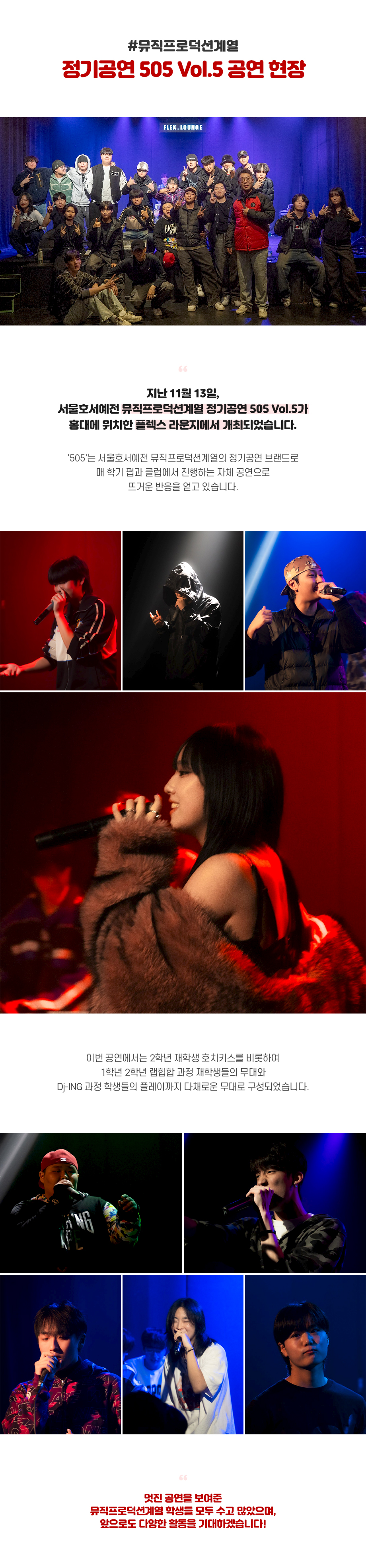 지난 11월 13일, 서울호서예전 뮤직프로덕션계열 정기공연 505 Vol.5가 홍대에 위치한 플렉스 라운지에서 개최되었습니다. '505'는 서울호서예전 뮤직프로덕션계열의 정기공연 브랜드로 매 학기 펍과 클럽에서 진행하는 자체 공연으로 뜨거운 반응을 얻고 있습니다.
