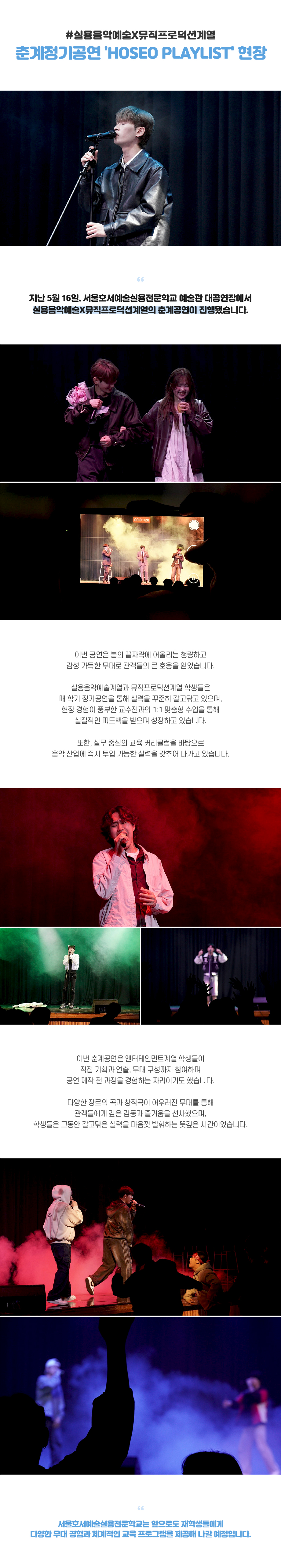 지난 5월 16일, 서울호서예술실용전문학교 예술관 6층 대공연장에서 실용음악예술계열과 뮤직프로덕션계열의 춘계공연이 진행됐습니다. 이번 공연은 봄의 끝자락에 어울리는 청량하고 감성 가득한 무대로 관객들의 큰 호응을 얻었습니다.