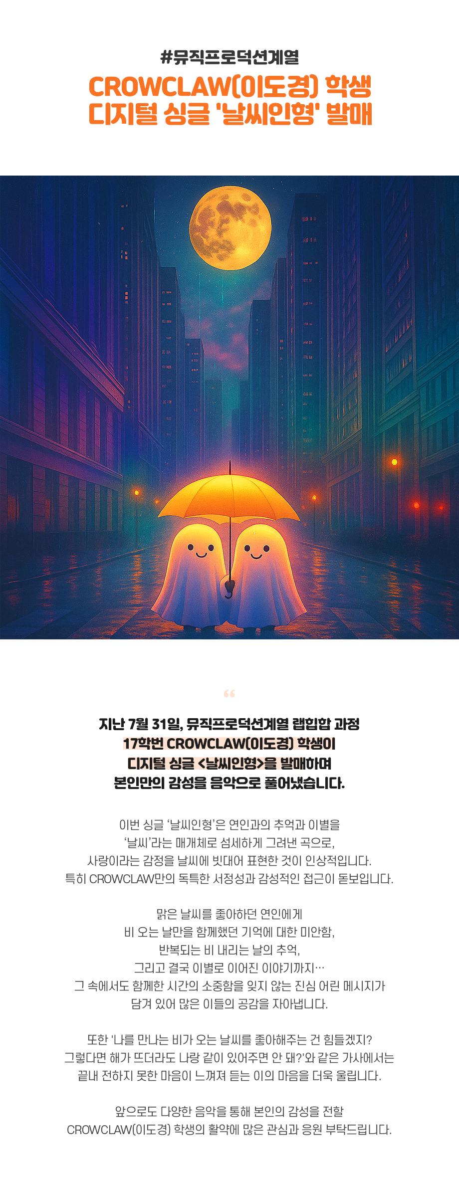 지난 7월 31일, 뮤직프로덕션계열 랩힙합 과정 17학번 CROWCLAW(이도경) 학생이 디지털 싱글 <날씨인형>을 발매하며 본인만의 감성을 음악으로 풀어냈습니다. 이번 싱글 ‘날씨인형’은 연인과의 추억과 이별을 ‘날씨’라는 매개체로 섬세하게 그려낸 곡으로, 사랑이라는 감정을 날씨에 빗대어 표현한 것이 인상적입니다. 특히 CROWCLAW만의 독특한 서정성과 감성적인 접근이 돋보입니다.