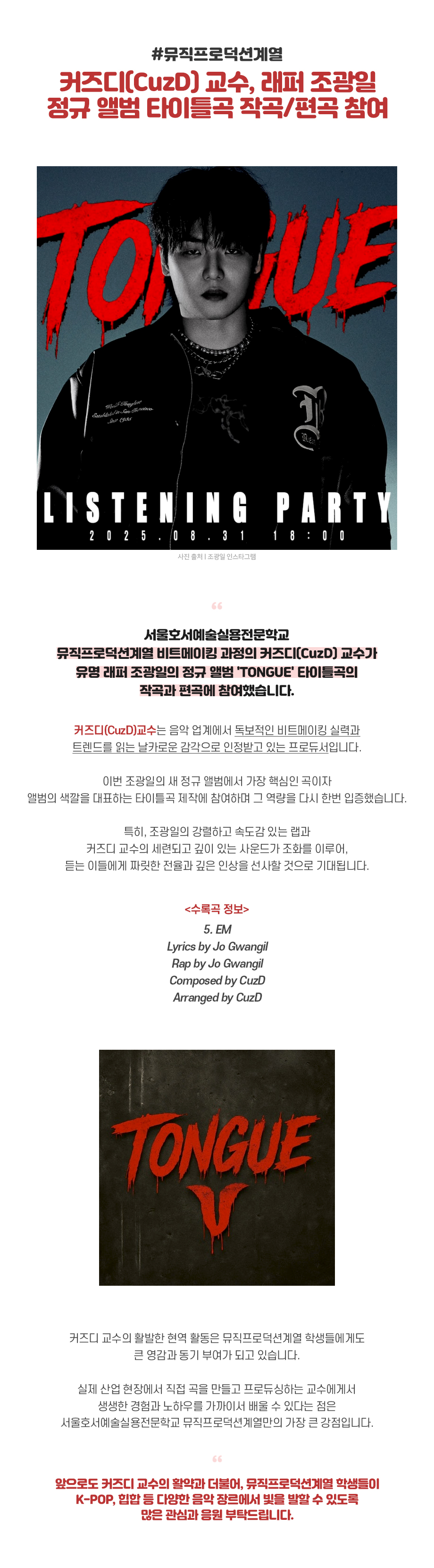 서울호서예술실용전문학교 뮤직프로덕션계열 비트메이킹 과정의 커즈디(CuzD) 교수가 유명 래퍼 조광일의 정규 앨범 'TONGUE' 타이틀곡의 작곡과 편곡에 참여했습니다. 커즈디(CuzD)교수는 음악 업계에서 독보적인 비트메이킹 실력과 트렌드를 읽는 날카로운 감각으로 인정받고 있는 프로듀서입니다.