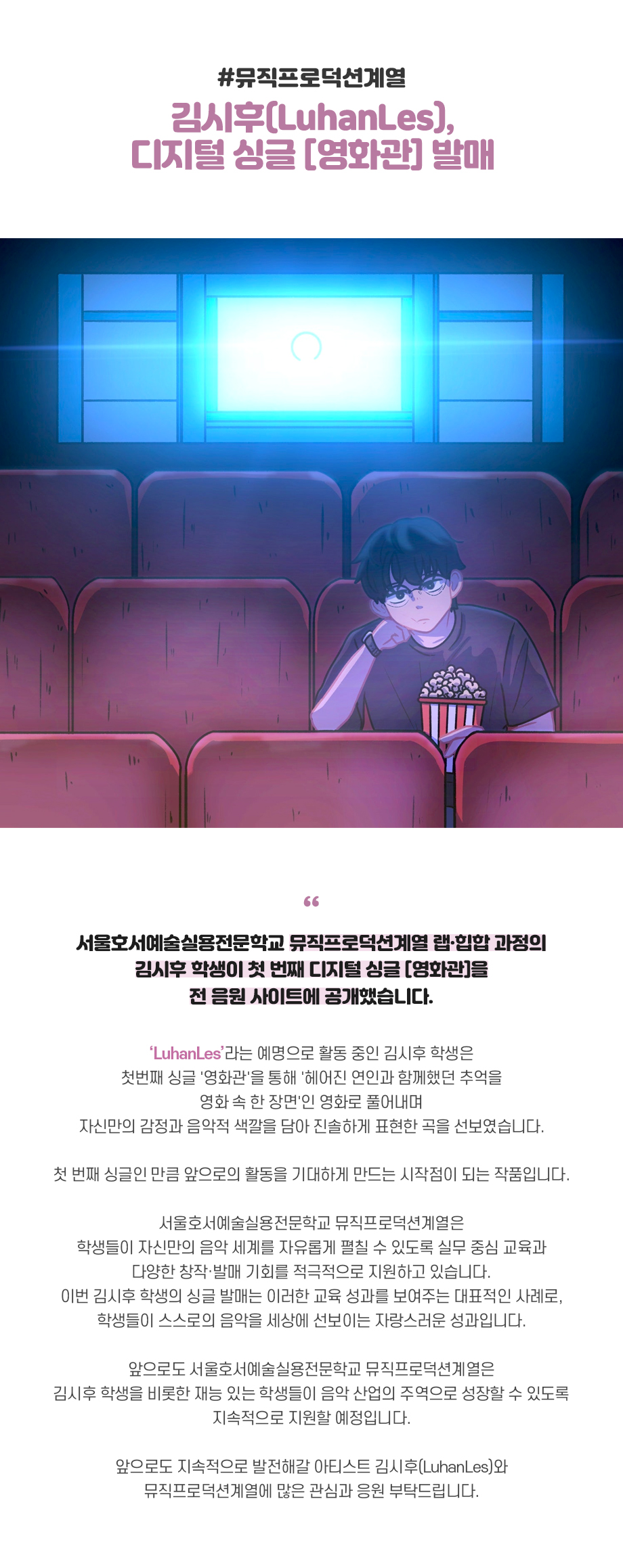 서울호서예술실용전문학교 뮤직프로덕션계열 랩·힙합 과정의 김시후 학생이 첫 번째 디지털 싱글 [영화관]을 전 음원 사이트에 공개했습니다. ‘LuhanLes’라는 예명으로 활동 중인 김시후 학생은 첫번째 싱글 '영화관'을 통해 '헤어진 연인과 함께했던 추억을 영화 속 한 장면'인 영화로 풀어내며 자신만의 감정과 음악적 색깔을 담아 진솔하게 표현한 곡을 선보였습니다.