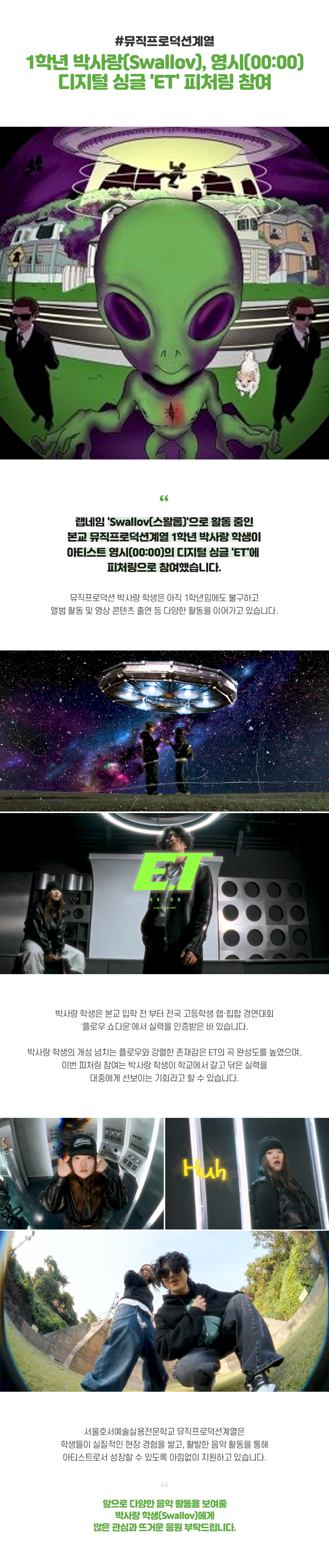 랩네임 'Swallov(스왈롭)'으로 활동 중인 본교 뮤직프로덕션계열 1학년 박사랑 학생이 아티스트 영시(00:00)의 디지털 싱글 'ET'에 피처링으로 참여했습니다. 뮤직프로덕션 박사랑 학생은 아직 1학년임에도 불구하고 앨범 활동 및 영상 콘텐츠 출연 등 다양한 활동을 이어가고 있습니다.